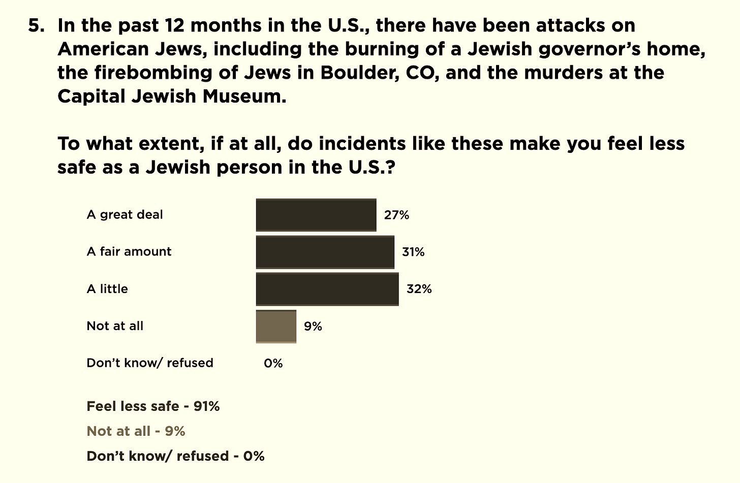 91% of American Jews say they feel less safe as a Jewish person in the United States due to violent attacks in the past year including the burning of a Jewish governor’s home, the firebombing of Jews in Boulder, CO, and the murders at the Capital Jewish Museum.